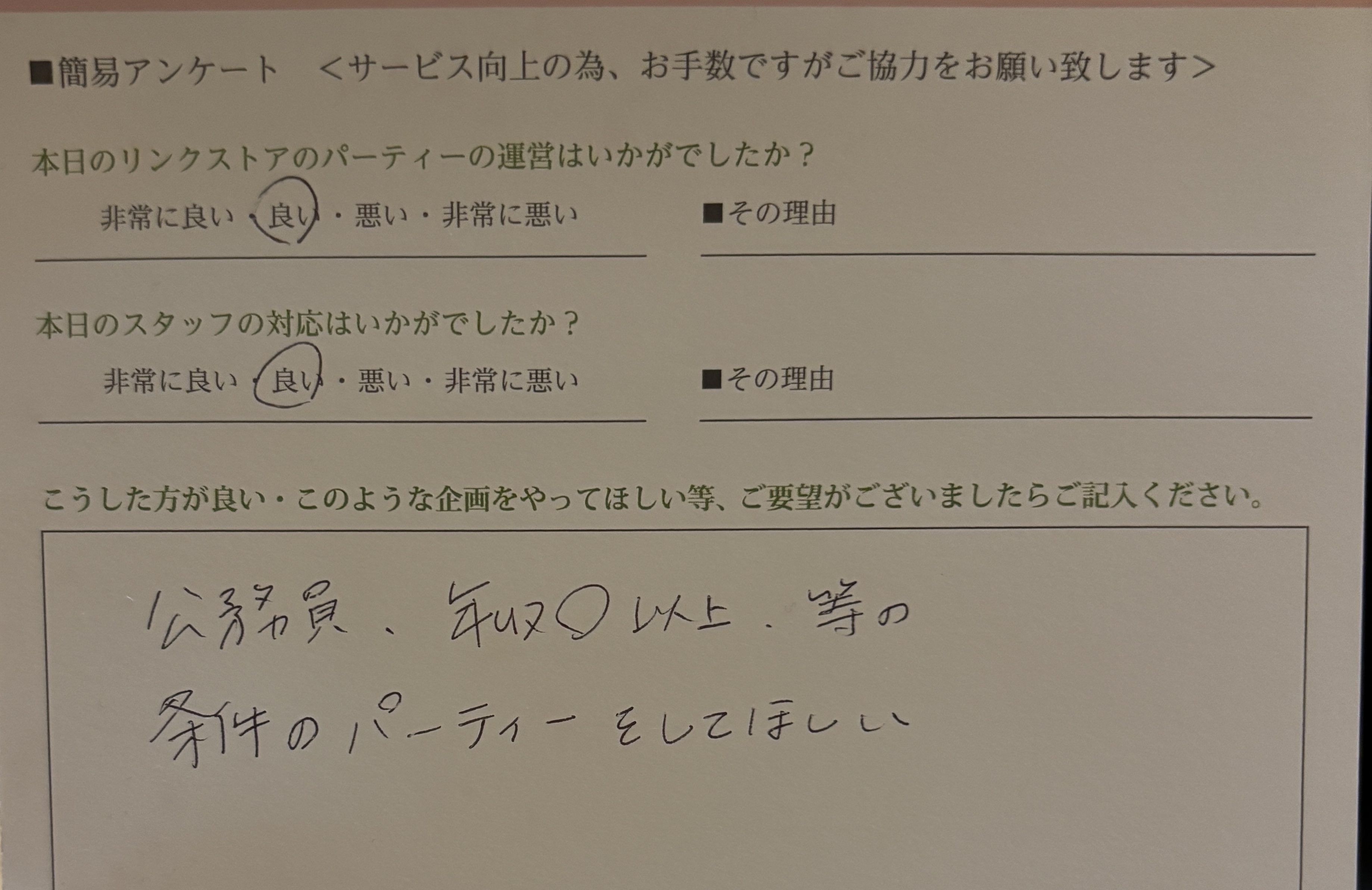 「再スタートをお考えの方向け」のパーティー開催についてのご要望、とても参考になります✨皆さまからいただくリアルなお声は、新しい企画づくりの大切なヒントになっております。