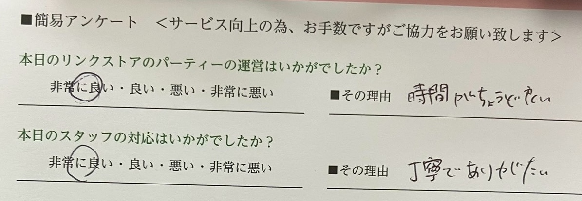 スタッフに対する温かいお言葉も、大変嬉しいです!!!今後も安心してパーティーを参加してもらえるよう日々接客のレベルを上げていきます