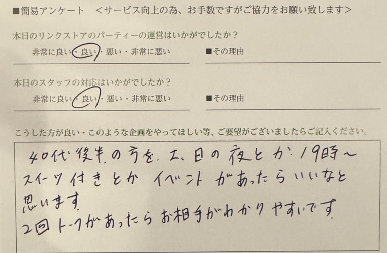 「再スタートをお考えの方向け」のパーティー開催についてのご要望、とても参考になります✨皆さまからいただくリアルなお声は、新しい企画づくりの大切なヒントになっております。