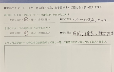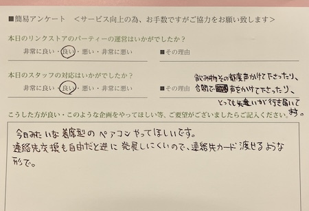 スタッフに対する温かいお言葉も、大変嬉しいです!!!今後も安心してパーティーを参加してもらえるよう日々接客のレベルを上げていきます